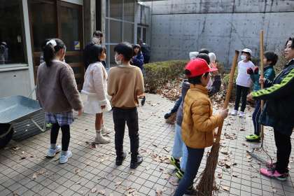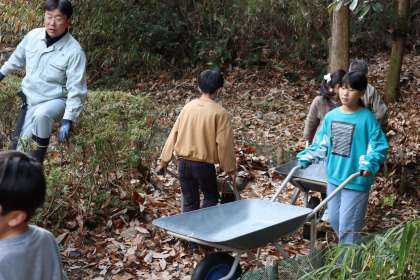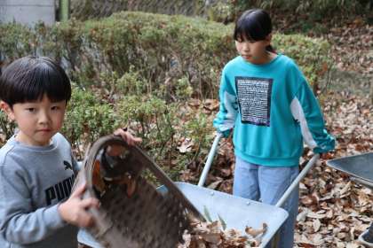 音楽室の裏あたりは、落ち葉の宝庫です。大きな山が20個ぐらいできたので、みんなで運んでいます。