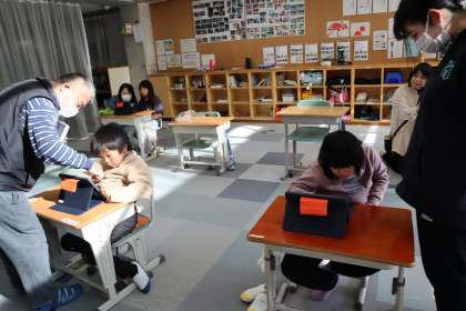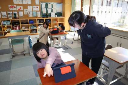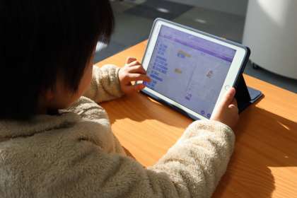 「スクラッチ」をしていました。タブレットに命令を入れて、キャラクターを動かしています。