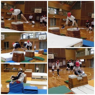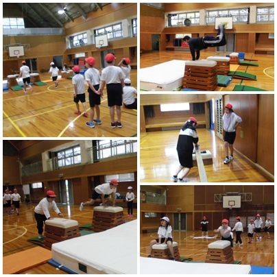 跳び箱運動では、学習カードを見ながら、それぞれ自分のペースで基本技や発展技の練習をしています。今日、挑戦している子が多かったのは、開脚跳びや閉脚跳び、台上前転です。跳び箱の高さに挑戦するのではなく、きれいな技を目指していきます。