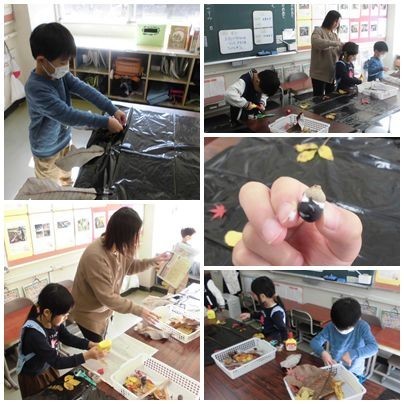 大きな黒色のビニール袋に、木工用ボンドやセロテープを使って、葉っぱや木の実をどんどん貼り付けていました。