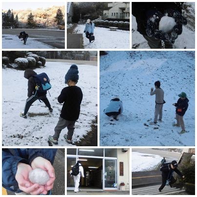 今朝の学校周辺は、うっすら雪が積もっていました。車道の凍結を気にする保護者のみなさんの心配をよそに、子どもたちは朝からどことなくウキウキした感じで登校してきました。雪玉を手に持ってくる子、雪に足跡をつけて走り回る子…、雪合戦ができるほどの積雪ではありませんでしたが、みんななんだかうれしそうでした。