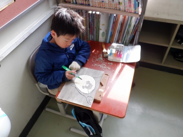 木版画に取り組んでいます。いろいろな種類の彫刻刀を使い分け、黙々と彫り進めていました。版が完成した子は、いよいよ印刷です。試し刷りしたものを確認して、さらに微調整していきます。
