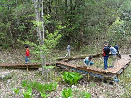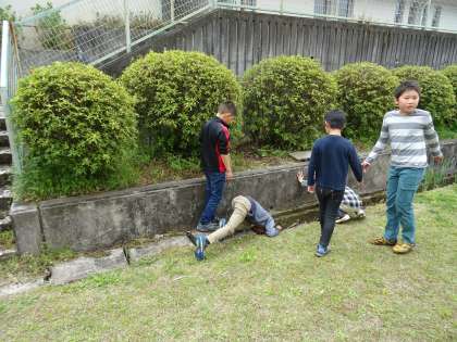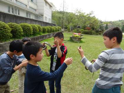 だんだん池でカナヘビを探す子どもたちです。溝の下にヘビがいるのを見つけます。2つの網で挟みこんで、捕獲です。シマヘビのつがいです。山へ返すことにしました。