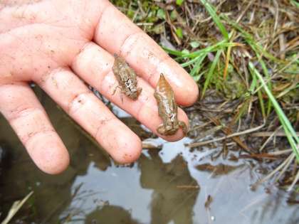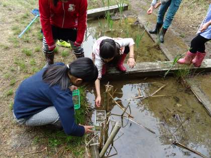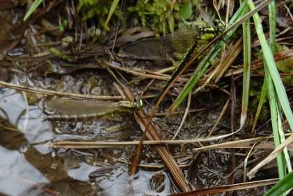 ビオトープに、様々な生き物の命の誕生があります。羽化したばかりのサナエトンボが葉にとまっていました。その下にはヤゴの抜け殻を見つけました。