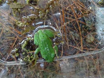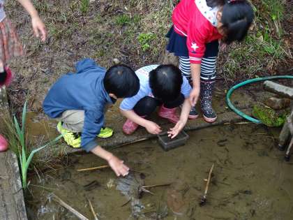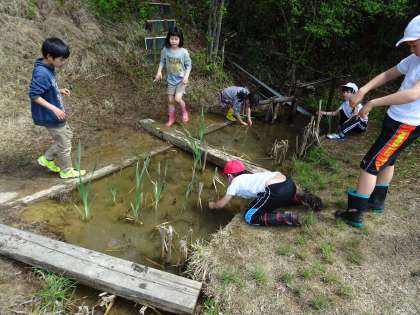 シュレーゲルアオガエルの卵を見つけたり、水の上を走るクモを発見したり、ビオトープには珍しいものがいっぱいです。子どもたちは夢中になって生き物を探します。