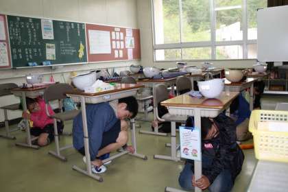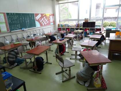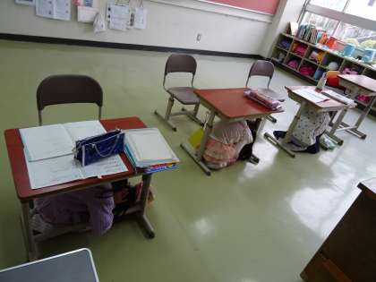避難訓練がありました。地震と火災を想定して命を守る訓練を行います。緊急地震速報で素早く机の下に入る子どもたちです。