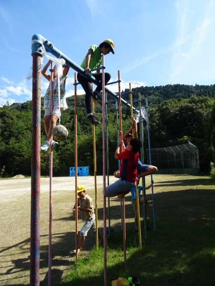 長い放課は3〜6年生が一緒になってトンボ採りに夢中でした。昼放課は、鬼ごっこをのぼり棒でやっていました。