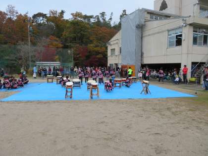 公民館まつりで、児童が地域の方と一緒に和太鼓を演奏しました。今日は、同時に「ウッドランド掛川〜森で遊ぼう〜」も行います。たくさんのお客さんの前で演奏しました。