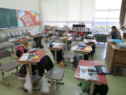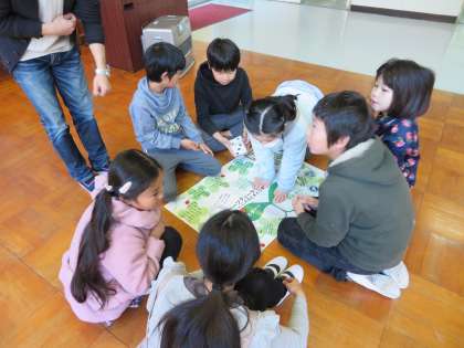 1時間目に抜き打ちの避難訓練を行いました。子どもたちは、急な放送にも戸惑わず、真剣に取り組むことができました。その後、ホールでセーフティーライフすごろくを班ごとに行いました。