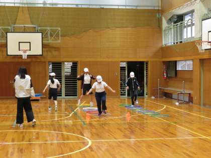 5,6年生が、走り高跳びの授業を行いました。準備運動は走り高跳びにつながる動きを取り入れたサーキットトレーニングです。その後、班ごとにダブレットで課題をつかんでいました。