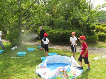5時間目に、1年生が水遊びをしました。水鉄砲で、お互いに掛けあい、みんなではしゃいでいました。