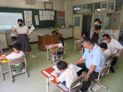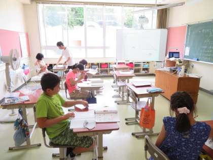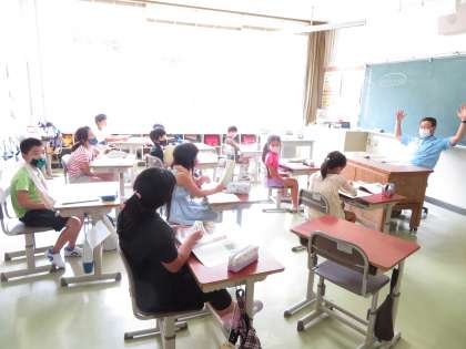 1年生は、ALTの先生と外国語活動をしていました。英語で言われた色の色鉛筆を持ってぬり絵を完成させます。3,4年生は社会、5年生は算数の授業です。