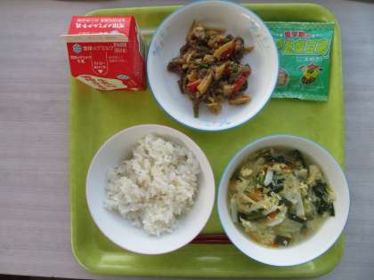 今日のメニューは、麦ご飯、牛乳、中華風卵スープ、チンジャオロース、味付け乾燥豆腐でした。