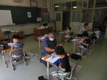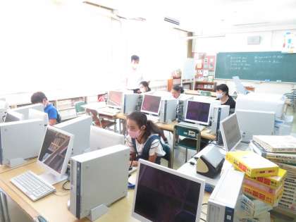 図工の授業で、木の葉をティッシュスタンプで色づけする1年生です。6年生は算数の授業を図書室で行っていました。