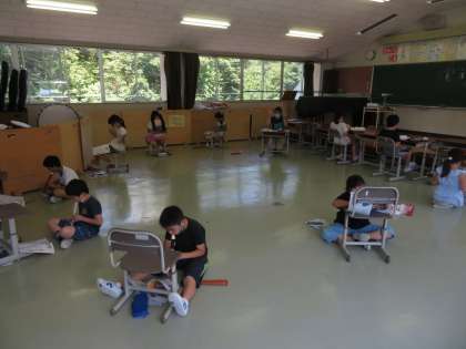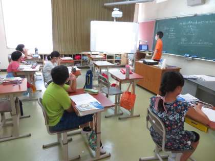 5年生の算数です。三角形の角度の問題を解いていました。3,4年生は、音楽室でリコーダーの練習をしていました。