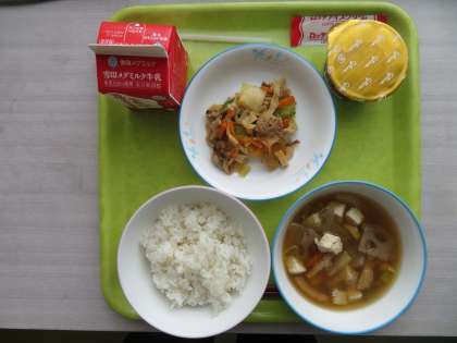 今日のメニューは、麦ご飯、牛乳、けんちん汁、野菜豚丼、アイスクリームでした。
