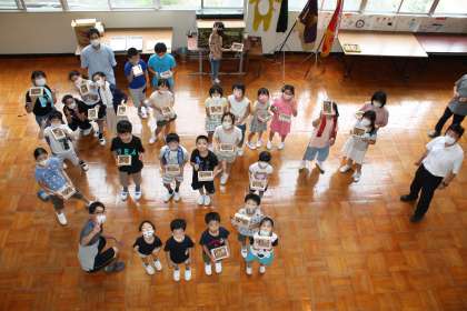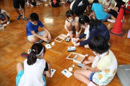 講師の先生からは、めずらしい小型のカミキリムシの標本を、児童にひとつずつプレゼントしてもらいました。これで、標本も完成です。