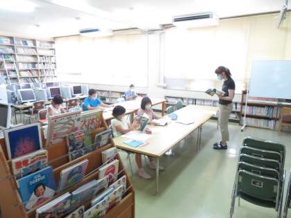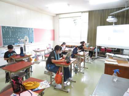 1年生は算数で、リズムに合わせて答える計算練習をしていました。5年生は、涼しい図書室で国語、6年生も国語です。宮沢賢治についてのお話です。