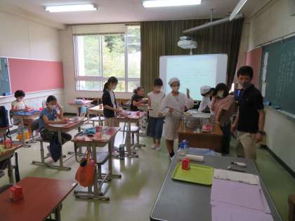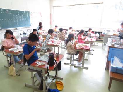 5,6年生の準備の様子です。自分たちで手際よく行います。1年生と、3,4年生の給食の様子です。3,4年生にはスクールカウンセラーの先生が入ってくださいました。