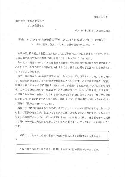 新型コロナウイルス感染症に関連した人権への配慮について 公開日 2020/09/07 更新日 2020/09/07 お知らせ 瀬P連より、「新型コロナウイルス感染症に関連した人権への配慮について」のお願いが届きました。PTA会員の方々にも配布しました。よろしくお願いします。