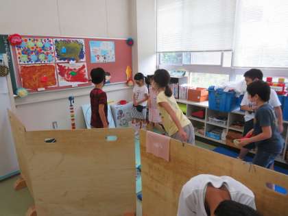 やまびこ教室で、遊ぶ子どもたちです。今日は、マジックテープで的に張り付くダーツを楽しんでいました。