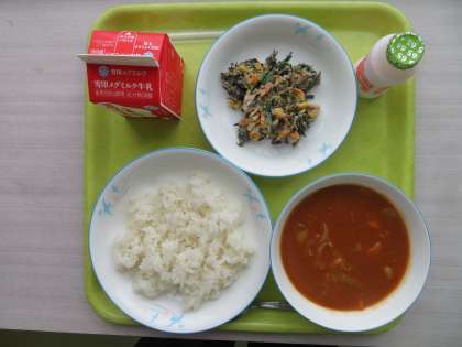 今日のメニューは、麦ご飯、牛乳、ハヤシシチュー、ひじきサラダ、ミニ発酵乳(いちご)でした。