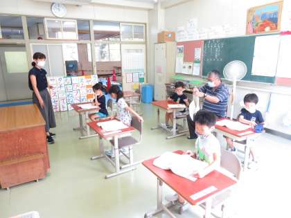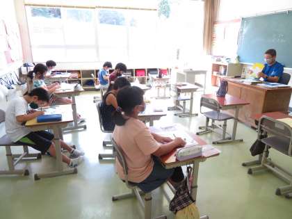 1年生は、昨日に続いてカタカナの練習です。4年生は、算数のテストです。コンパスや分度器を使ったテストです。5,6年生は、体育館でダンスの練習をしていました。