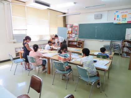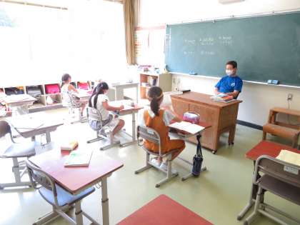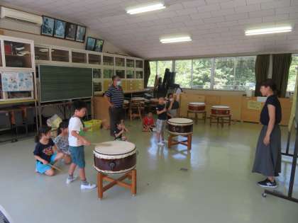 4年生は国語で漢字の練習、3年生はローマ字の学習をしていました。1年生は音楽室で太鼓の練習です。