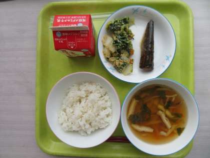 今日のメニューは、麦ご飯、牛乳、さわにわん、いわし梅煮、アーモンド和えでした。