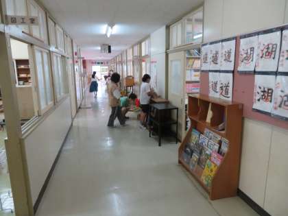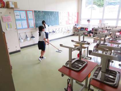 掃除の時間の様子です。特別教室などは、縦割りで協力して掃除をします。各教室は、少人数です。図書室の辞書を廊下の書棚に移す作業を手伝っている子もいます。