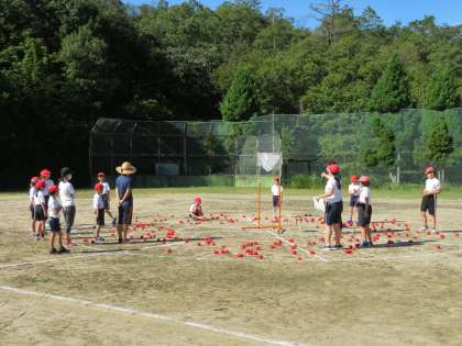 玉入れ練習 公開日 2020/09/14 更新日 2020/09/14 今日のスナップ 今日は天気もよく、比較的涼しいので、外でスポーツフェスタ練習を行いました。まずは玉入れです。密集を避けるため、一人一人の範囲を仕切っての玉入れです。誰がどこから投げるか指示を出す6年生です。