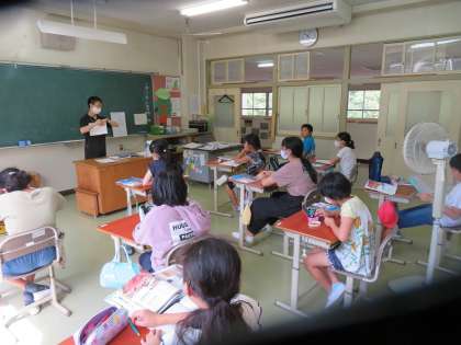 スポーツフェスタ練習が早く終わったので畑の草取りをする1年生です。漢字の練習をする4年生、社会の歴史を学習する5,6年生です。