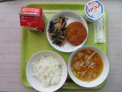 今日のメニューは、ご飯、牛乳、とうがん汁、里芋コロッケ、五色和え、ヨーグルトでした。
