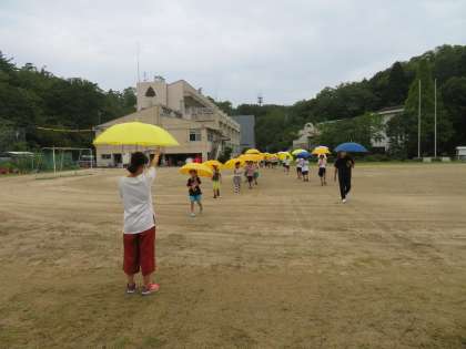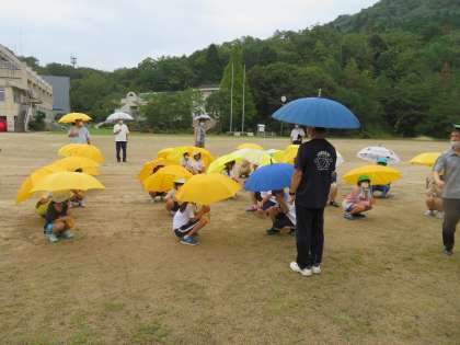 避難訓練 公開日 2020/09/18 更新日 2020/09/18 今日のスナップ 雨で延期になっていた避難訓練を3時間目に行いました。あいにく今日も直前に雨が降ってきたので、傘を差して、靴に変えての避難訓練としました。それでも緊急地震速報で机の下に身を隠す練習、地震、火事の時の避難経路の確認はできました。どの子も、真剣に静かに取り組み100点満点でした。