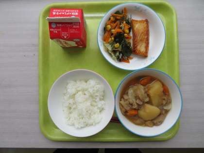 今日のメニューは、ごはん、牛乳、肉じゃが、いかの生姜焼き、海藻サラダでした。