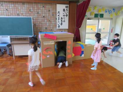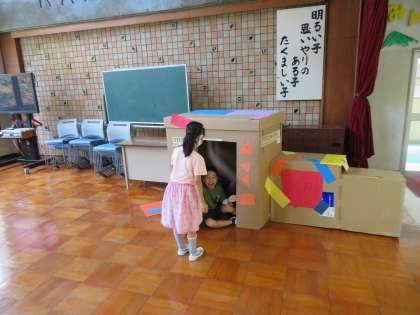 1年生が、先週作った「ひみつきち」で遊んでいました。トイレ工事で必要なくなった大きな段ボールをもらって作りました。