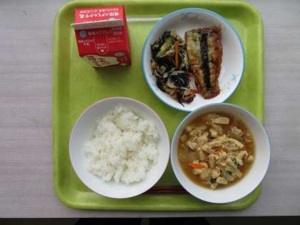 今日のメニューは、ご飯、牛乳、高野豆腐の卵とじ、サンマの蒲焼き風、ひじきと枝豆のサラダでした。