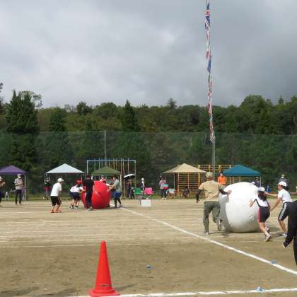 紅白対抗1種目目は、大玉送りです。子どもと保護者で協力して大玉を運びます。紅が早くゴール台に乗せました。