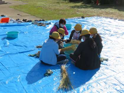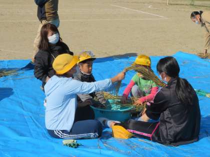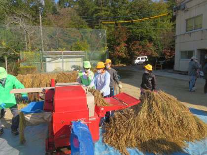 高学年はエンジンハーベスタも体験します。稲穂に残った籾は手で取っていきます。
