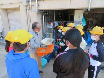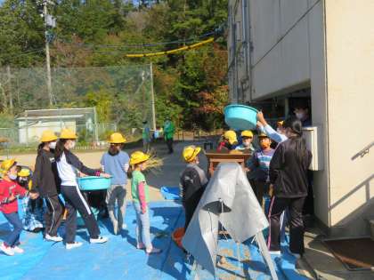 唐箕で余分な藁を飛ばします。籾殻を飛ばして玄米にする機械も紹介していただきました。