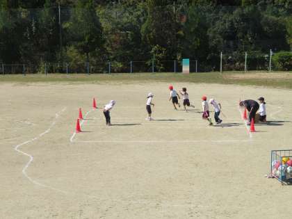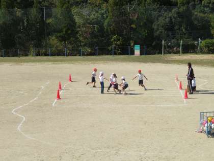 1年生が体育で、しっぽ取りをして盛り上がっていました。