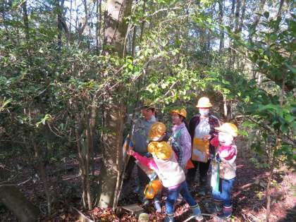 班ごとに活動開始です。森の中に散らばって、シンボルツリーを決めます。