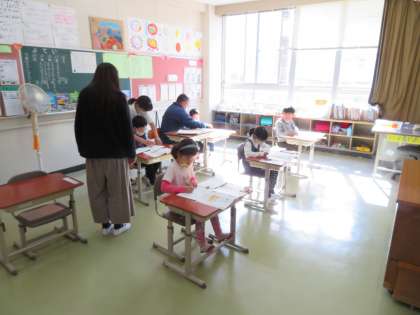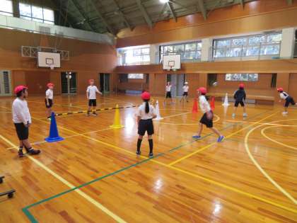 1年生は算数で、引き算の学習、3,4年生は体育でプレルボールを行っていました。