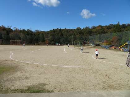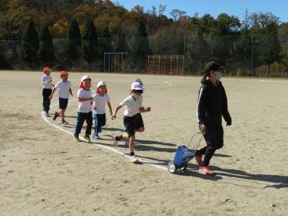 1年生が先生がラインを引く後についてかけ足をしていました。そのあと、順番にジグザグスキップなどをします。