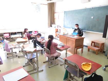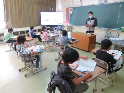 3、4年生が国語の授業をしています。3年生は漢字学習、4年生は「世界にほこる和紙」という内容です。