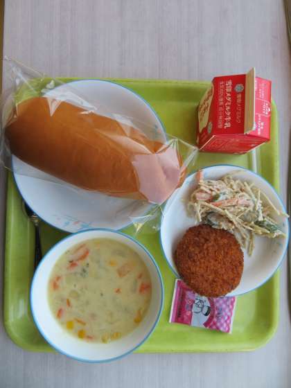 今日のメニューは、ロールパン、牛乳、豆乳スープ、さつまいもコロッケ、ごぼうサラダ、大豆チョコでした。