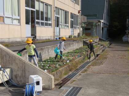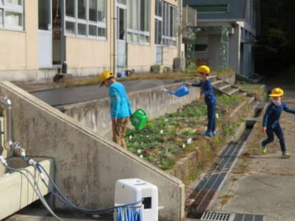 1年生は、休み時間になると、すぐに畑の水やりをします。大きく育つといいですね。