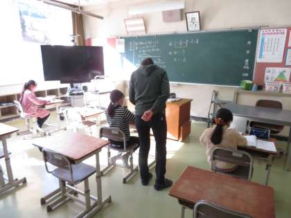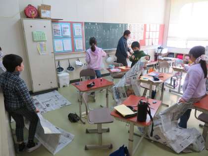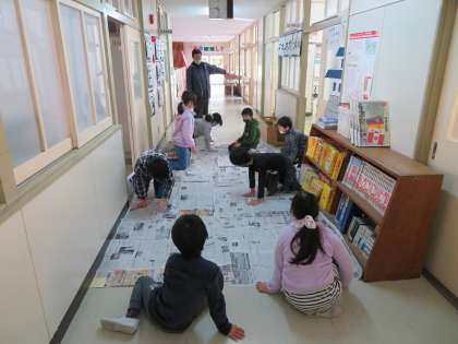 3年生は、分数の引き算を学習しています。4年生は、1平方メートルの新聞紙を敷き詰めて、廊下や教室の面積を測っています。