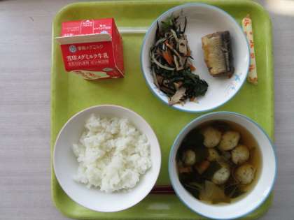 今日のメニューは、ご飯、牛乳、つみれ汁、サンマのみぞれ煮、五色和え、棒チーズでした。