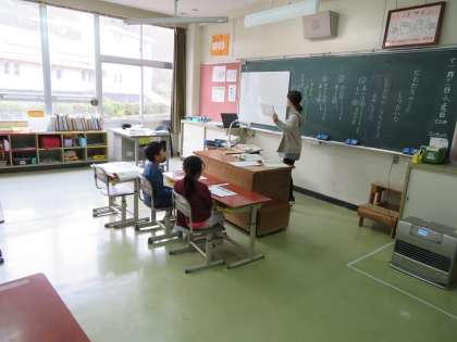 5年生は、グラフや表をもとに自分の考えや意見をまとめる内容です。1年生は、お互いに質問し合い、それをタブレットで録画し、文章にする授業でした。